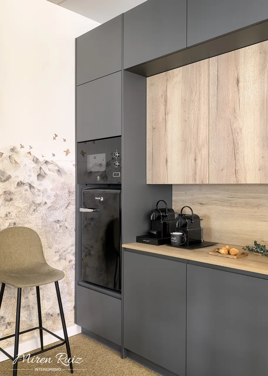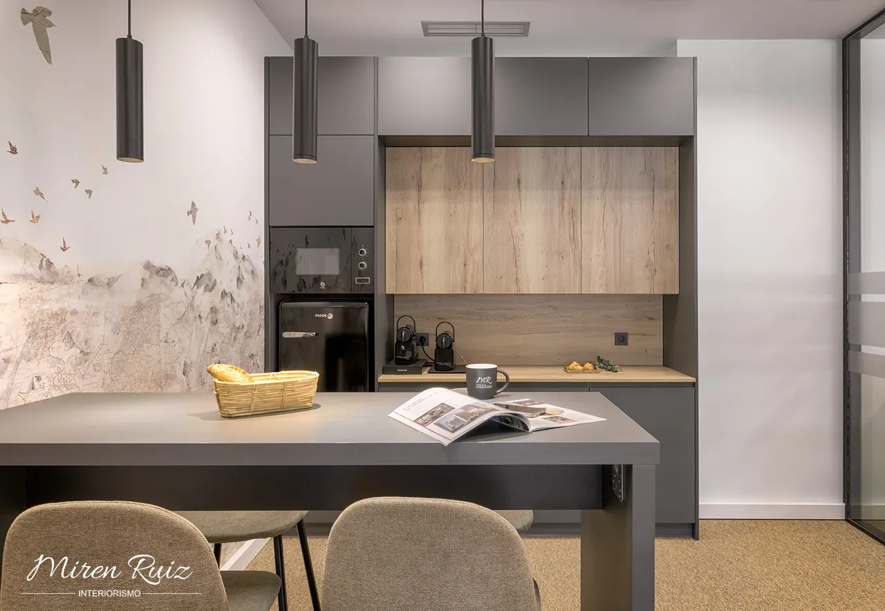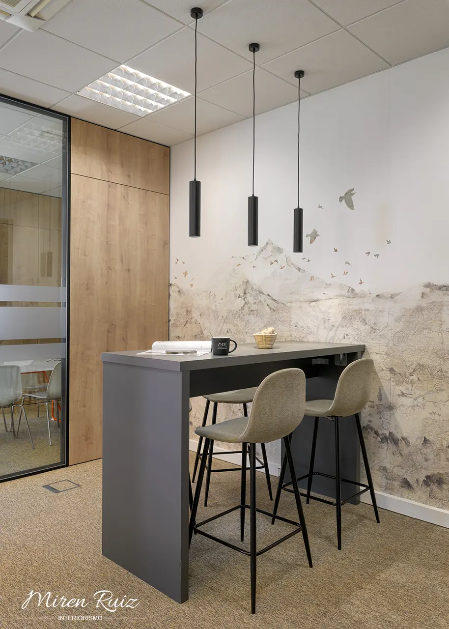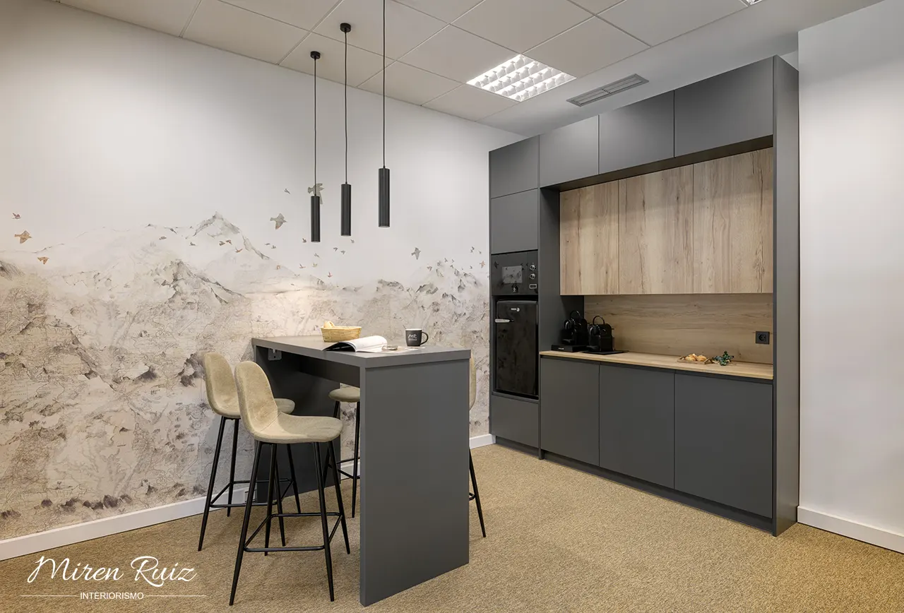 Proyecto de interiorismo en oficinas donde diseñamos un espacio de descanso pensado para aportar bienestar y funcionalidad al entorno laboral. Se creó una zona office totalmente adaptada a las necesidades del día a día, complementada con mobiliario práctico y una cuidada selección estética. El mural decorativo en la pared se convierte en el punto focal del espacio, aportando frescura, identidad y un carácter más humano al lugar de trabajo.