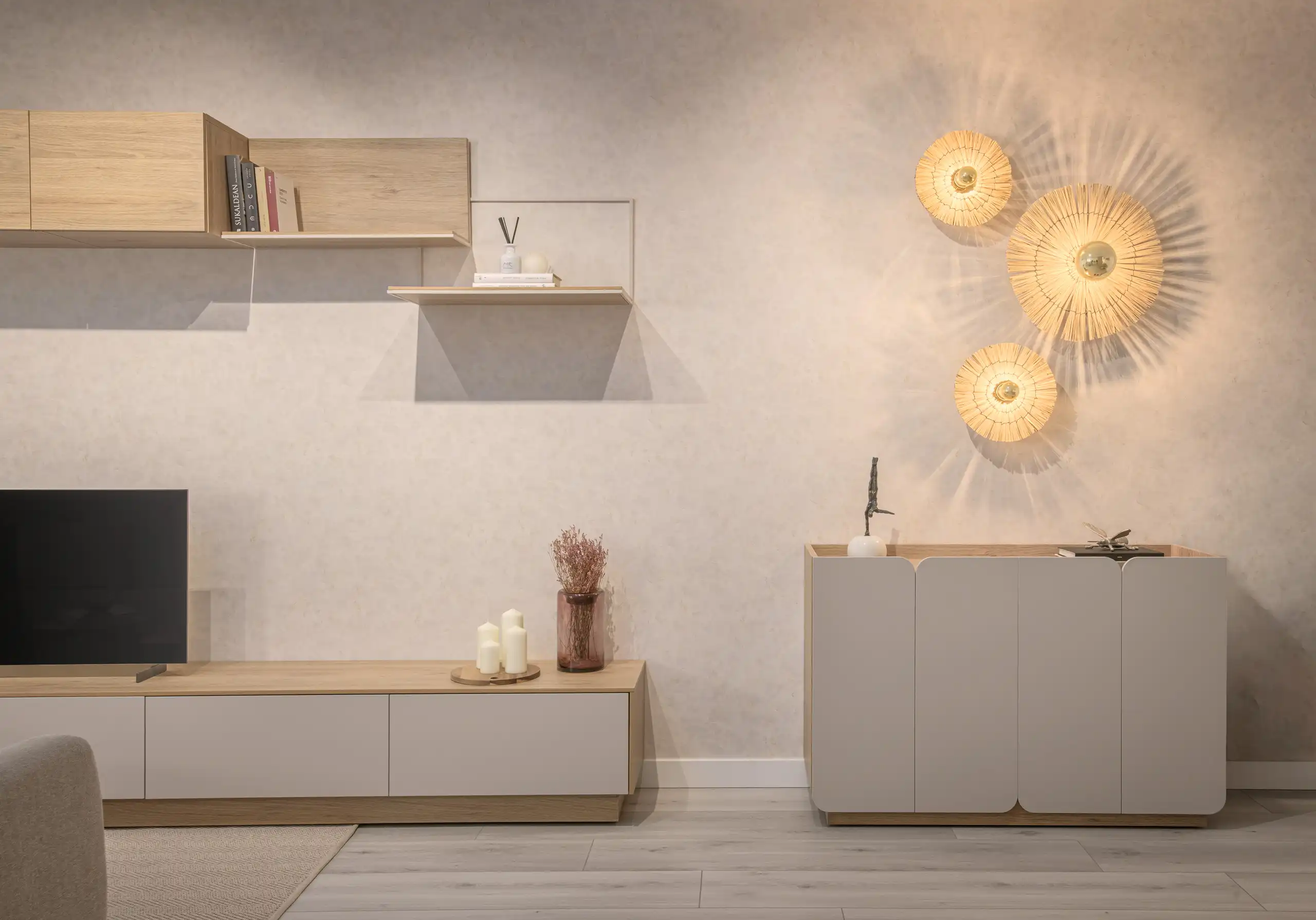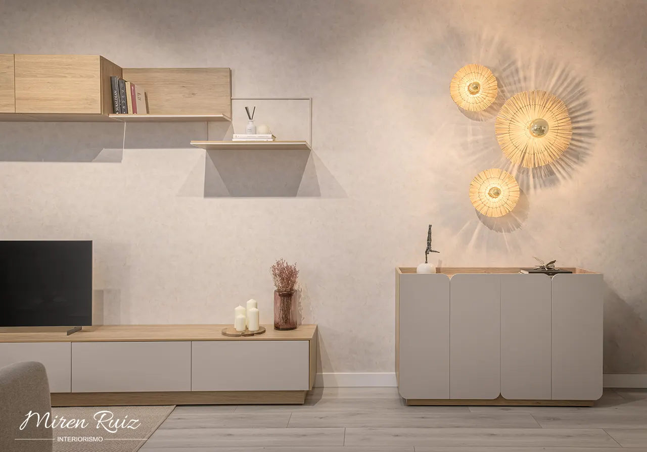 La iluminación decorativa en la pared aporta carácter y convierte este rincón en un punto focal del salón. La combinación de formas orgánicas y luz cálida añade profundidad y un toque muy personal al espacio.