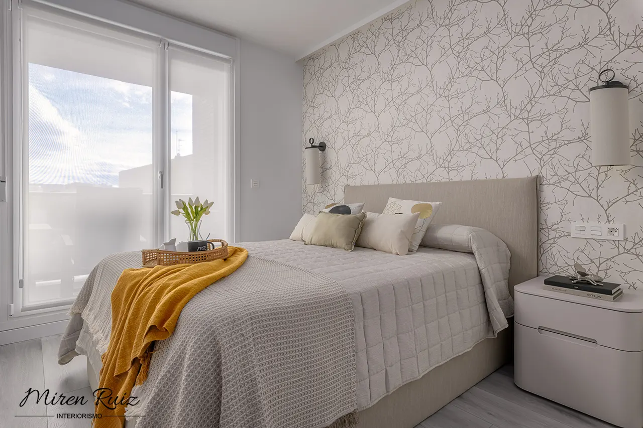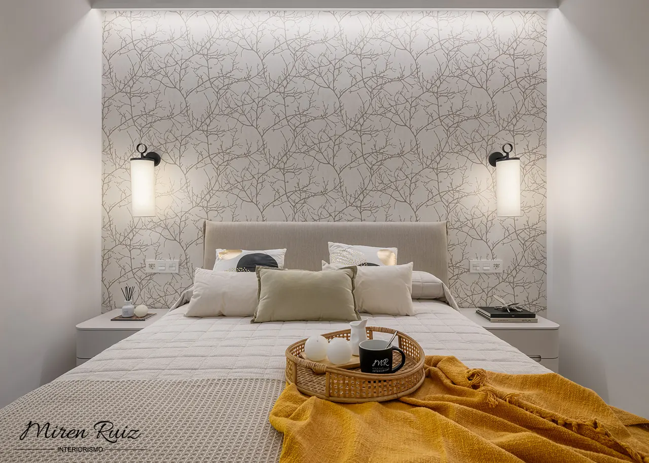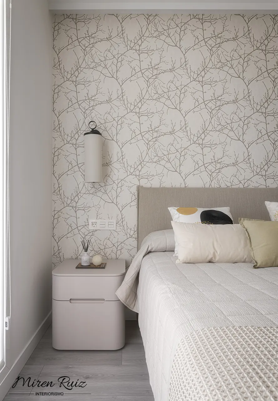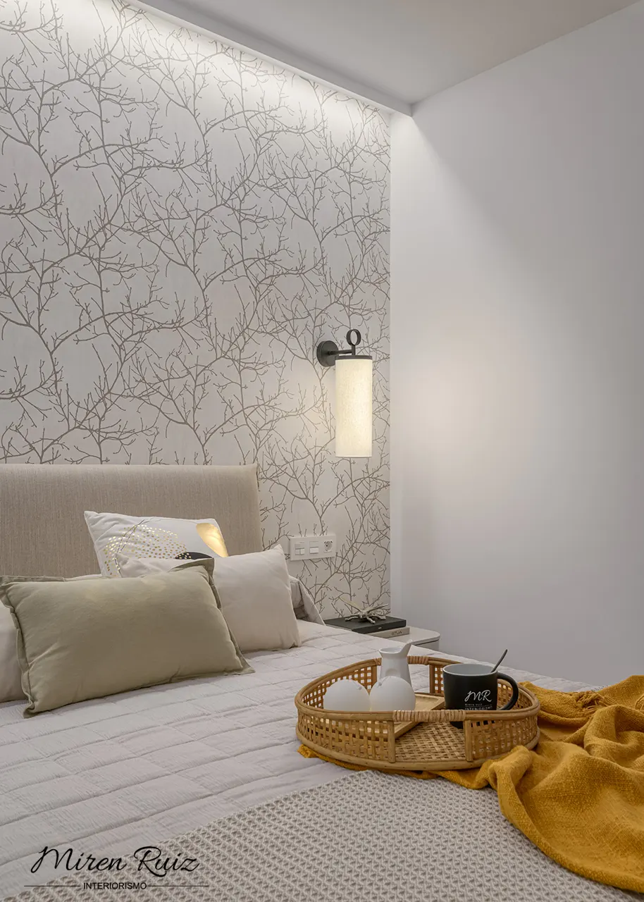 Transformamos el dormitorio en un refugio cálido y relajado mediante textiles naturales, una paleta suave y un papel pintado de inspiración orgánica. La luz filtrada potencia la serenidad del ambiente y realza los matices de cada material.