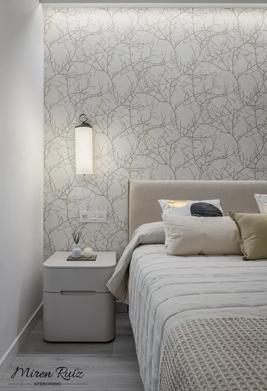 Las líneas redondeadas de la mesilla y la calidez del papel pintado aportan suavidad al conjunto. Cada pieza se seleccionó para generar un espacio sereno y atemporal, pensado para disfrutar día a día.