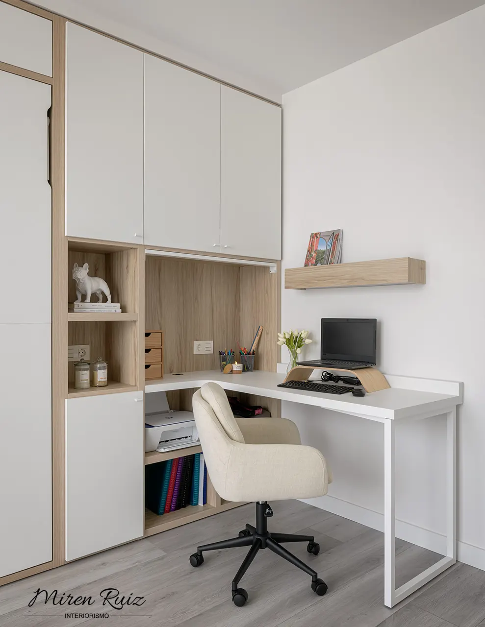 La zona de trabajo se resuelve con un escritorio amplio, cómodo y luminoso. Los tonos neutros y la madera natural ayudan a crear un ambiente calmado que favorece la concentración y el bienestar.