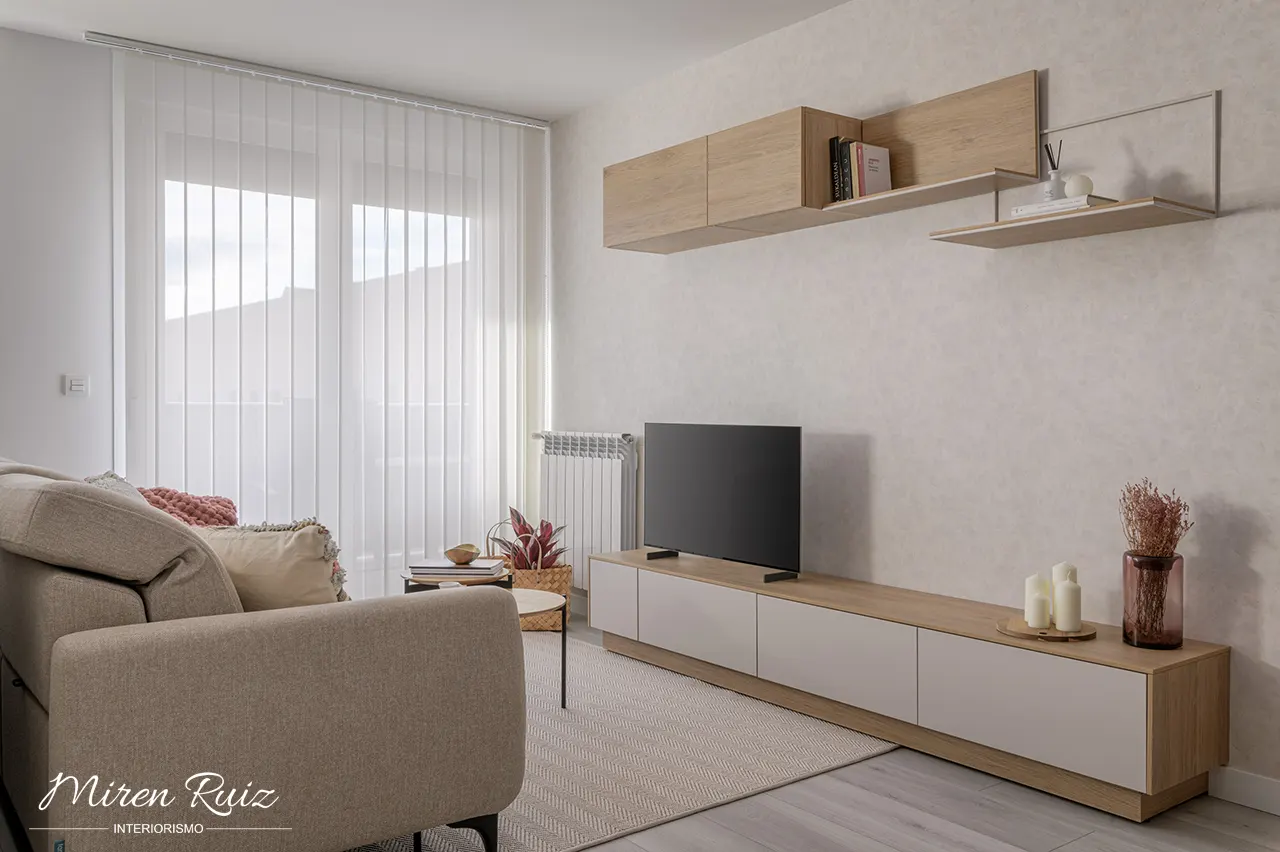 El salón se renueva con mobiliario cálido, texturas suaves y una composición ligera que deja respirar el espacio. Los estores verticales filtran la luz y generan una atmósfera relajada desde la que se disfruta toda la estancia.