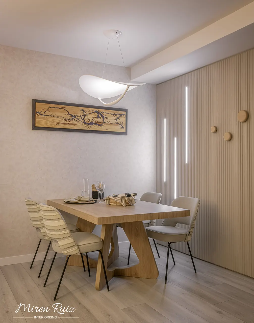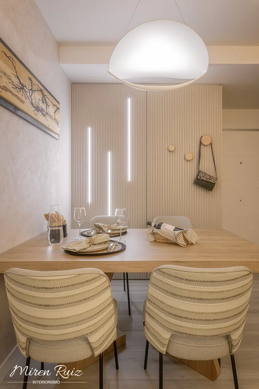 El panelado a medida de la entrada oculta todo el conjunto de registros eléctricos y se convierte en un volumen decorativo gracias a las líneas verticales y la iluminación LED integrada. Este diseño propio permite que la zona de comedor gane presencia, orden y continuidad estética, reforzando la identidad del proyecto.